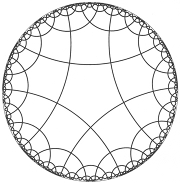 Such constructions are not the only way to visualize the hyperbolic plane. More than a century ago, Henri Poincaré (1854–1912) introduced a method for representing the entire hyperbolic plane on a flat, disk-shaped surface. In Poincaré’s model, the hyperbolic plane is compressed to fit within a circle. The circle’s circumference represents points at infinity. In this context, a straight line, meaning the shortest distance between two points, is a segment of a circular arc that meets the Poincaré disk’s circular boundary at right angles.