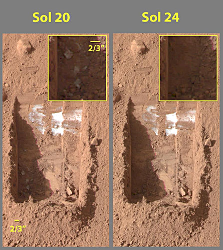 For the past three weeks, the Phoenix science team has speculated about what the bright, hard material found under the lander and uncovered in the trenches could be. The stuff could have been ice, salt or something else, explained Texas A&M scientist Mark Lemmon, a coinvestigator of the Stereo Surface Imager that captured those images. But “the things are gone,” they melted from the trench, he says. “Salt does not behave like that, so we believe these things are water ice.”