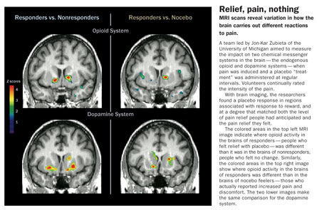 The scientists then administered the “pain relief” (which did not include, in fact, any actual drugs, only placebo) and exposed participants to pain by injecting low-concentration saltwater into a large jaw muscle for 20 minutes. PET images were taken of the participants’ brains during the exposure. Pain lessened for some and strengthened for others—just what happens in clinical trials, the researchers reported in the February Archives of General Psychiatry.