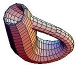 One way to describe a Klein bottle is in terms of instructions for making one from a rectangular sheet of paper. Glue together the two horizontal sides, and glue together the vertical sides after twisting one side 180 degrees. By itself, the first instruction produces a cylindrical tube. The second instruction by itself produces a Möbius strip, a remarkable mathematical surface that has only one side and one edge (see Möbius and His Band, July 8, 2000).