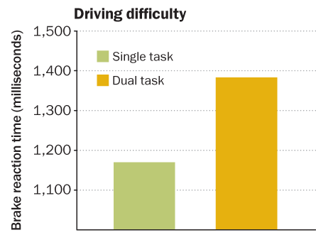 Since then, Strayer and his colleagues have fine-tuned understanding of just how incapacitated drivers are when on the phone. In June, Strayer’s team described monitoring 32 drivers in city traffic and asking them to listen to a radio, have a conversation with a passenger, use a hand-held phone, use a hands-free phone or operate voice-to-text technology. Compared with driving free of any distractions, radio was the least problematic, while voice-to-text was the most. The three conversations were about equally distracting and led to substantially degraded driving, marked by less scanning for potential hazards, monitoring mirrors less regularly and showing poor surveillance at pedestrian crosswalks and four-way stops. This effect occurred even though the tasks didn’t require the drivers to take their eyes off the road.