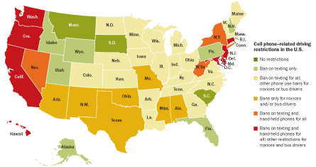 As a result, the science of distracted driving has run well ahead of policy. Not a single U.S. state bans hands-free cell phone talking for most adult drivers. Some states limit hand-held cell phone use, but many others apply bans to only bus drivers or novices. Three states have no restrictions whatsoever on calling or even texting while driving.