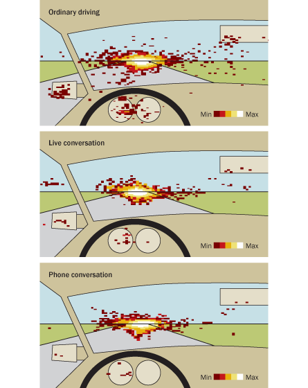 Such observational studies don’t establish cause and effect. So scientists at Complutense University of Madrid actually got into cars with volunteer drivers and distracted them. The researchers had drivers make phone calls using hands-free phones that needed only the push of a button to work. Special vision-tracking devices showed that conversations requiring extra thought or concentration diminished drivers’ extent of visual scanning, speed control, detection of warning flashers and decision-making ability. That study, which appeared in Transportation Research Part F in 2002, still stands as one of the clearest examples of what it means not to give full attention to the road.