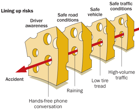 British scientist James Reason, a specialist in risk analysis, developed what he dubbed the “Swiss cheese” model of risk. He applied it to industrial environments such as nuclear power plants and aircraft carriers. Strayer argues that it fits with distracted driving, too.