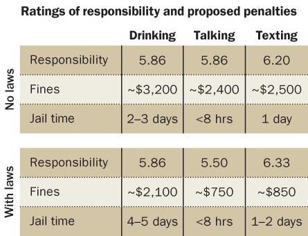 There have been some changes in attitudes — many people have turned against texting while driving and consider it a problem. But other distractions still get mild scofflaw treatment. Atchley’s team asked volunteers to read hypothetical car-crash scenarios, rate the responsibility of the drivers and mete out justice. The participants reviled drivers who were drunk or texting but handed down harsher “sentences” to the drunk drivers. Drivers responsible for crashes while talking on cell phones got lower fines and milder jail time that was similar to that given to drivers responsible for crashes while not distracted at all.