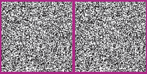 FLICKERING FIGURES. To prove that real numbers are uncountable, Georg Cantor invented his diagonal argument. He started with a square array of numbers where each row is different and then changed each number that falls on the diagonal. Reading the diagonal as a new row gives a number that’s not in the original array, so if there had been infinite rows, there would still be an additional possible row. Artist and mathematician Helaman Ferguson has created a visualization of that argument in this stereoscopic pair of images. The two square arrays of pixels are identical except for the diagonals (running from top left to bottom right), where a black pixel in one is a white pixel in the other. When viewed stereoscopically, the images combine, and the diagonal stands out from the background array, appearing to flicker. |