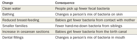 But a bacteria-free world is neither practical nor healthy. Blaser and others think that hygienic practices are not only getting rid of pathogens but are also causing populations of helpful bacteria to dwindle, leading to disease. This disappearing-microbiota theory is slightly different from the hygiene hypothesis, which holds that reduced exposure to pathogens leads to a maladjusted immune system, which in turn causes allergies and asthma (SN: 8/26/00, p. 134). Breaking up with the bacterial buddies that humans evolved with could have even more profound effects on health.
