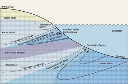 From late spring until early autumn, the water table drops because growing plants are extracting more water from the soil than is returning as precipitation. So, after a few months, bay water is drawn into the submerged sections of the aquifer.