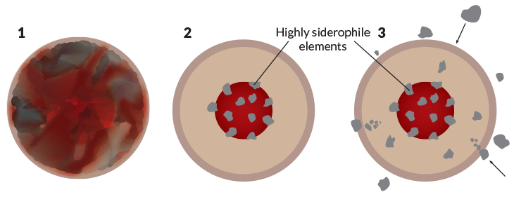 On Earth, meteorite impacts could have delivered half a percent to 1 percent of the planet’s total mass. Many meteorites that fall to Earth and are analyzed contain relatively high amounts of highly siderophile elements, which suggests that meteorites hitting the early Earth would have carried a lot of them, too. If so, then the cosmic smashups regularly showered Earth with a fresh coating of gold, platinum and other precious elements. By this time, Earth had already finished forming its core, so the highly siderophile elements remained sprinkled throughout its upper layers rather than being vacuumed into its depths.