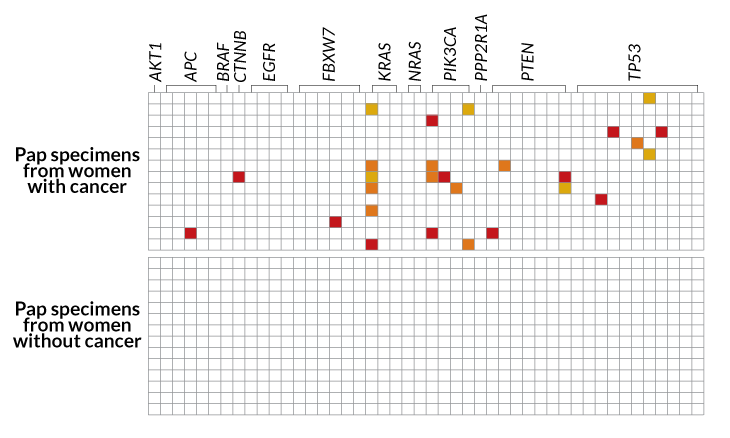 Isaac Kinde helped developed the PapGene test. The test picked up cancerous mutations in Pap test specimens from 14 women with uterine or ovarian cancers (top), but found no mutations in 14 women without cancer (bottom).