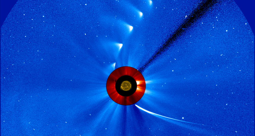 DEATH MARCH Comet ISON’s trajectory around the sun appears in a time-lapse series taken by the Solar and Heliospheric Observatory. The most recent image, in the upper right, was taken at 6:30 a.m. EST on December 1, 2013. The image of the sun at center was taken by NASA's Solar Dynamics Observatory.