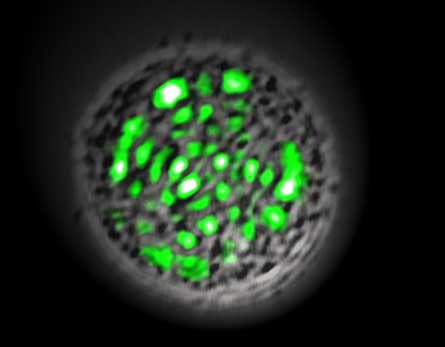 News Physics It lives and lases Coherent light from a cell By Devin Powell June 12, 2011 at 4:05 pm - More than 2 years ago Share this:Share Share via email (Opens in new window) Email Click to share on Facebook (Opens in new window) Facebook Click to share on Reddit (Opens in new window) Reddit Click to share on X (Opens in new window) X Click to print (Opens in new window) Print The first living laser is nothing to be afraid of. It’s just a single cell pulsing with light that may lead to new ways of probing microscopic realms. LASER LIFE A genetically engineered cell creates laser light (green) using a protein first discovered in jellyfish. M.