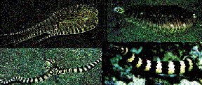 Sometimes, the octopus fled with its arms aligned in a flattened, striped oval, looking much like a common poisonous flatfish. On four occasions when damselfish pestered an octopus, Norman saw it poke six of its legs down a burrow and spread the other two. They sported bands and waved gently, resembling the sea snakes that prey on damselfish.