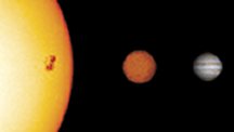 News Astronomy It’s a star, but not much of one By Ron Cowen March 29, 2005 at 4:15 pm - More than 2 years ago Share this:Share Share via email (Opens in new window) Email Click to share on Facebook (Opens in new window) Facebook Click to share on Reddit (Opens in new window) Reddit Click to share on X (Opens in new window) X Click to print (Opens in new window) Print Astronomers have discovered the smallest star known, and it’s hardly bigger than Jupiter. SMALL FRY. A newfound, diminutive star (middle) is much smaller than the sun (left) and only slightly larger than Jupiter. ESO Researchers found the tiny star indirectly, through its interaction with a much larger star that it closely orbits.
