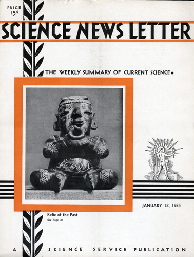 Among the exhibits of Mayan pottery from Guatemala was the little figurine shown on the front cover of this week’s Science News Letter. This figure has the interesting device of a slit in the back of the head letting the light show through the eyes. As you walk past the figure, this spot of light appears to move, thus giving the effect of moving eyes following you.
