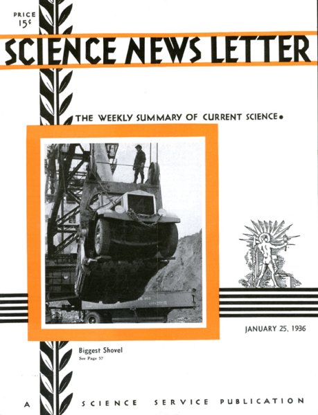 The illustration on the front cover of this week’s Science News Letter shows the shovel in the act of lifting the huge truck. In 1930, a 320,000-pound steam shovel with 20-cubic-yard scoop capacity, then the largest in the world, was pictured on the cover. (See SNL, Jan. 18, 1930).