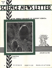 The dark, oblong areas pictured on the front cover are all that remain of a pre–Ice Age collision of cosmical magnitude, the smattering of a part of what is now the southeastern United States with fragments of a comet. This is the belief of Profs. F.A. Melton and William Schriever of the University of Oklahoma. The photograph emphasizes the great area covered by these depressions, for each little dot is a tree and there are thousands of dots in some of the ovals.