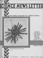 Long ago some observant writer remarked that in the sea, many of the plants look like animals and many of the animals, like plants. Support for this view can easily be found in the strange sea urchin pictured on the cover of this issue of the SCIENCE NEWS LETTER. It grows on the Great Barrier Reef off the coast of Australia; the photograph of this specimen was supplied by Melbourne Ward, an Australian zoologist who has done much work in the naturalists’ paradise of the antipodes. The species is known locally as the “slate pencil sea urchin” because its thick spines are frequently used as natural slate pencils. More learnedly, it rejoices in the technical name of Heterocentrotus mammalatus.