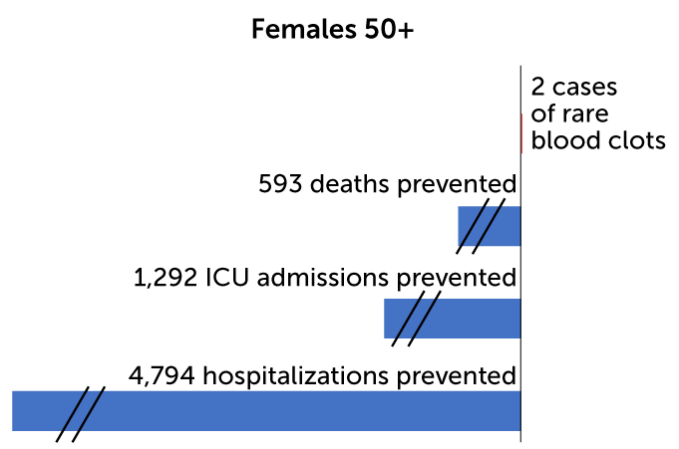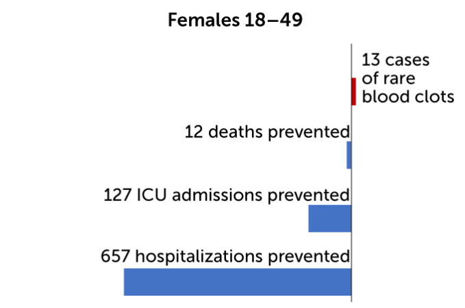 On an individual level, for every million doses of the vaccine given to women 18 to 49 years old, the CDC predicts 13 cases of blood clots would result. At the same time, immunization would prevent 12 deaths, 127 ICU admissions and 657 hospitalizations for women in that age group. By contrast, for every million men 18 to 49 years old who get the vaccine, two cases of blood clots are expected. The benefits for those men include preventing 11 deaths, 114 ICU admissions, and 601 hospitalizations. And for people over 50 the benefits are even greater. No cases of blood clots are expected in older men, and two cases in every million doses are expected for women 50 and older. Benefits would include preventing hundreds of deaths and thousands of ICU admissions and hospitalizations.