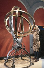 One measuring device, the astrolabe, had two parts. Its back contained a moveable sighting arm and a scale for measuring altitude, while the front had a flattened map of the heavens that helped to calculate the future position of objects.