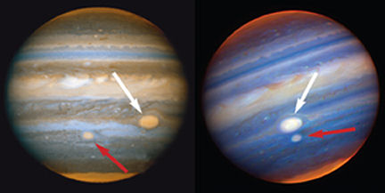 In April, a visible-light image (left) taken by the Hubble Space Telescope showed that a new giant storm (red arrows) in Jupiter’s southern hemisphere was about 62,000 kilometers away from the planet’s centuries-old Great Red Spot storm (white arrows).