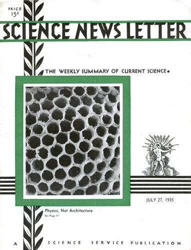 Not often tightly squeezed cylinders at that, as you will see if you inspect a natural honeycomb or a hornets’ nest such as Cornelia Clarke has photographed for the cover of this issue of the Science News Letter. Most of the actual cavity openings are approximate circles, inscribed within a hexagon. A little closer inspection will show that the cells are built separately, each as a cylinder, and that they are partly cemented together by looser wefts of tissue between the walls.