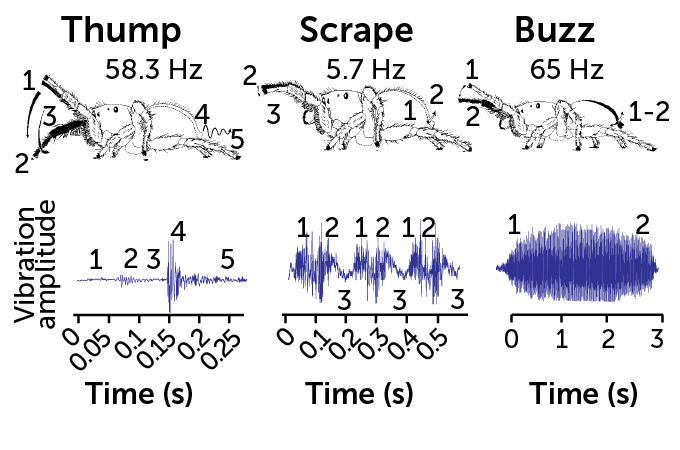 Male jumping spiders work hard to get and keep a potential mate’s attention. By tapping his front legs and oscillating his abdomen at various speeds, measured in hertz, or Hz, a male can produce three types of seismic signals that researchers can pick up using laser vibrometry.