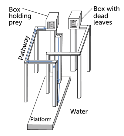 “Some of the things that they do could keep you awake at night,” says arachnologist Fiona Cross of the University of Canterbury in Christchurch, New Zealand. Cross and renowned jumping spider expert Robert Jackson, also at Canterbury, have tested this group of species, including the clever Portia fimbriata, with all sorts of challenges in the lab. In one study, the team placed a spider atop a tower on a platform (shown here) surrounded by water, knowing that jumping spiders avoid water whenever possible. From the perch, the spider could see two other towers: one topped with a box containing prey and one with a box of dead leaves. Both were accessible from the platform by a raised walkway with multiple turns. After surveying the scene, most spiders climbed down the tower and chose the correct path to the target — even when that required initially heading away from the target, losing sight of the prey, and first passing the start of the incorrect walkway.
