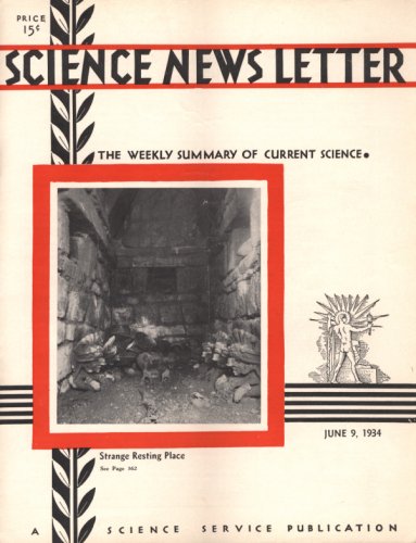 The interior of a tomb similar to number 50 is pictured on the front cover of this week’s Science News Letter. It is the fortieth discovered, and illustrates clearly the V-shaped construction of the ceiling, niches in back and side walls, quantity of plain, black pottery, and the customary number of five ornate funerary urns. Three sit on one side of the extended skeleton and two on the other. The tomb is about a yard wide. Earth, sifting through cracks in the stone, has covered the stone floor and the objects on it with a thick layer.