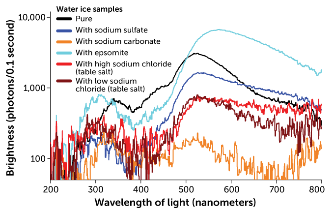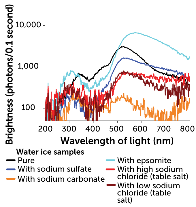 The ice samples all gave off a whitish glow, because they emitted light at many different wavelengths. But the brightness of each ice sample depended on its composition. Ice containing sodium chloride, also known as table salt, or sodium carbonate appeared dimmer than pure water ice. Ice mixed with magnesium sulfate, on the other hand, was brighter.