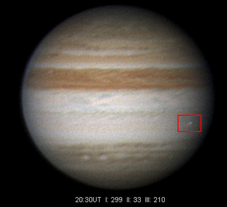 IMPACT A fireball on Jupiter (in box) appears in this still image from a video taken by amateur astronomer Christopher Go in the Philippines.