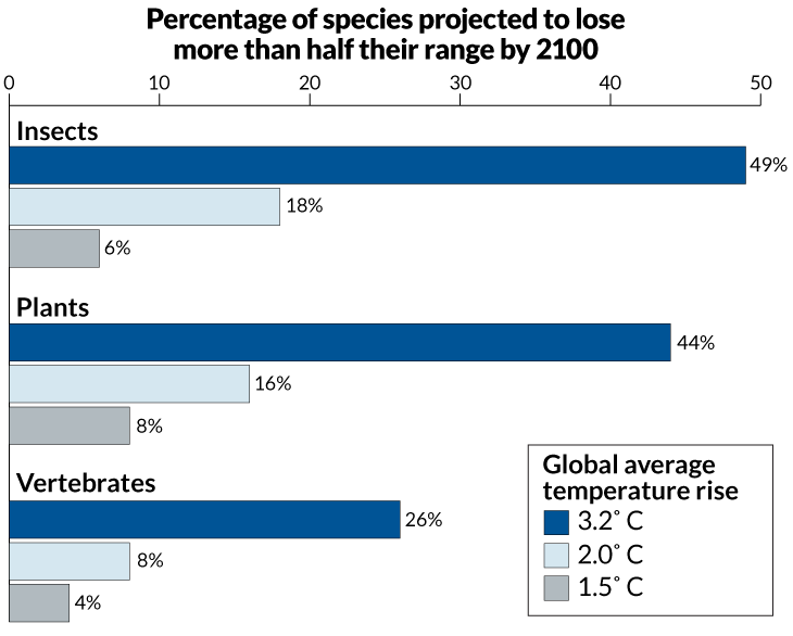 Different global warming scenarios — of 1.5 degrees Celsius, 2 degrees Celsius or 3.2 degrees Celsius — will have very different impacts on the geographic ranges of terrestrial insects and other invertebrates, plants and vertebrate animals.