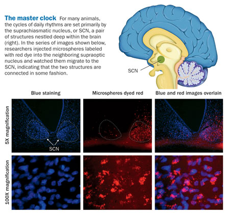The researchers concluded that some brain chemical released from the SCN was stifling communication between the other two neuron clusters for most of the time when the rat was asleep. Eliminating other candidate chemicals suggested that it must be vasopressin working with some other yet-to-be-identified substance, the team reported online February 28 in Nature Neuroscience. Vasopressin is made by about a third of SCN neurons.