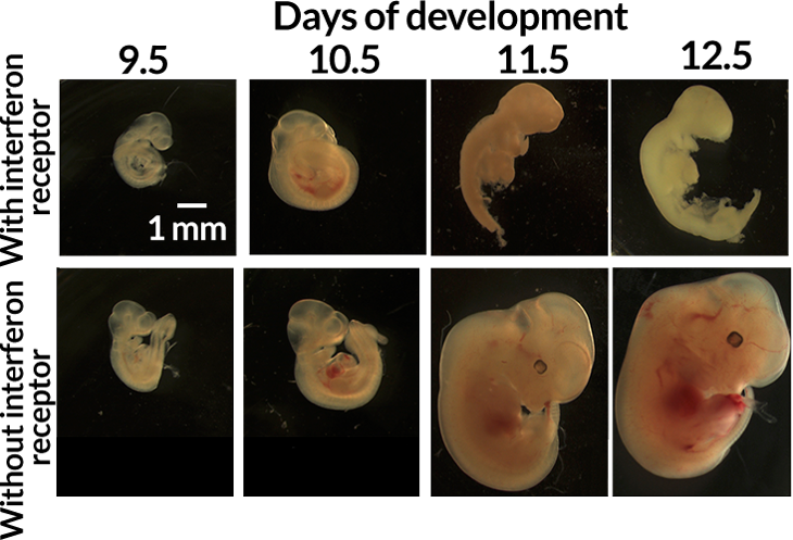 Pregnant mice were infected with Zika virus early in pregnancy (corresponding to mid–first trimester in humans). After 12 and a half days, which roughly corresponds to the second trimester in humans, all of the mouse fetuses with the interferon receptor had died, while those without it continued to develop.