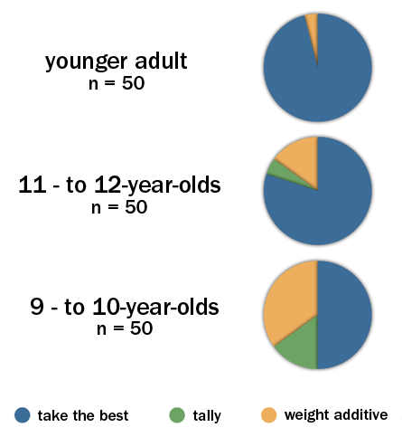 Volunteers of all ages usually began by adding cue values or tallying top-ranked cues for each car. Nearly all young adults and more than three-quarters of 11- to 12-year-olds learned to focus on the best available cue by the final round of 30 races. In contrast, only half of 9- to 10-year-olds learned to do so.