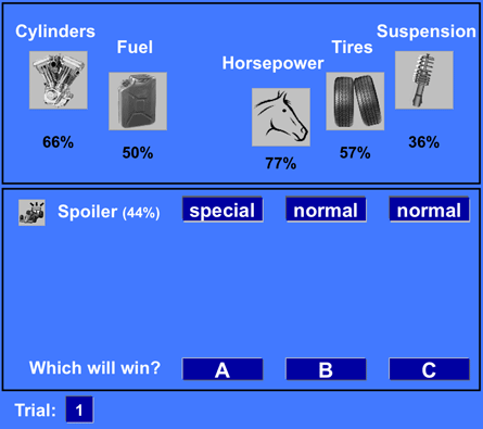 Mata’s team examined the ability of 50 fourth graders, 50 sixth graders and 50 young adults to predict which of three cars in a computer display would win a series of races based on six vehicle characteristics associated to varying degrees with speed. Volunteers received small amounts of money for each accurate prediction. By clicking on icons, the volunteers could see the predictive power — on a scale from one to seven — of as many or as few cues for each car as desired. Participants made predictions for 210 races and received feedback on performance after the first 30 races.