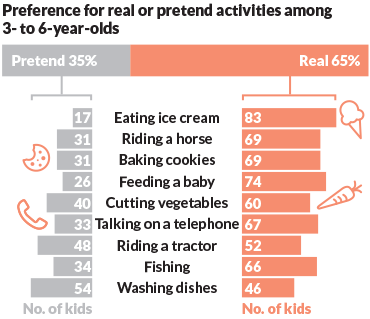 When asked by the experimenter whether they would rather, say, cut real vegetables with a knife like the first child or pretend to do so like the second child, preschoolers chose the real activity almost two-thirds of the time. Among the preschoolers, hard-core realists outnumbered fans of make-believe, the researchers found. Whereas 16 kids always chose real activities, only three wanted to pretend on every trial. Just as strikingly, 48 children (including seven of 26 of the 3-year-olds) chose at least seven real activities of the nine depicted. Only 14 kids (mostly the younger ones) selected at least seven pretend activities.