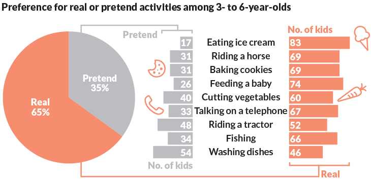 Kids often said they liked real activities for practical reasons, such as wanting to learn how to feed babies to help mom. Hands-on activities also got endorsed for being especially fun or novel. “I’ve never talked on the real phone,” one child explained. Reasons for choosing pretend activities centered on being afraid of the real activity or liking to pretend.