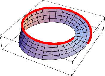 A Möbius strip (or band) is a remarkable surface having only one side and one edge. You can make a model of one by joining the two ends of a long strip of paper after giving one end a 180-degree (or half) twist.