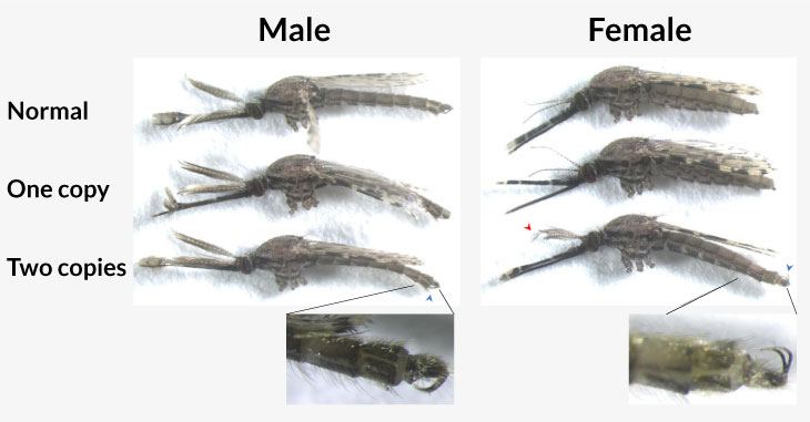 Female Anopheles gambiae mosquito’s development was altered by a gene drive that disrupts the doublesex gene. Females that inherited two copies of the gene drive (bottom right) developed antenna (red arrow) and claspers (blue arrow and enlarged images) similar to males. The females’ mouth parts also changed, preventing them from biting to get a blood meal. These alterations made the females unable to lay eggs.