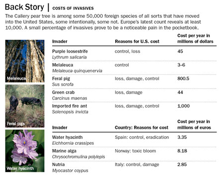 Invasive species disrupt ecosystems and, to put the problem in more immediate terms, cost a lot of money, suggests work by David Pimentel of Cornell University. In his last tally, from 2005, unwelcome aliens, from feral pigs and starlings to water weeds and plant pathogens, cost the United States almost $120 billion a year.