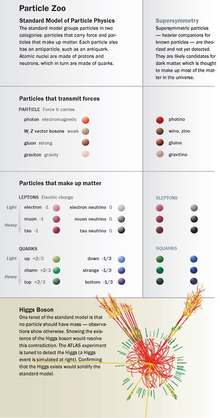 As revealed in Einstein’s famous equation, E=mc2, the enormous energies generated at the LHC will translate into large masses — and, particle physicists hope, a cornucopia of subatomic particles never before seen. Many are betting that they will see evidence of the elusive Higgs boson, a hypothetical particle first proposed in the 1960s that could help explain why some elementary particles have mass. Finding the Higgs would be the crowning achievement for what physicists call the standard model, a highly successful theory that unifies three of the four known forces in nature and groups the fundamental constituents of matter into two broad categories.