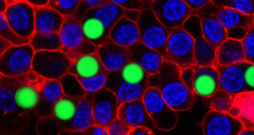 LASER TAGS Seven of the cells in this micrograph contain lasers in the form of plastic beads (green). The cells are enclosed in red; the nuclei are blue.