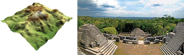 Like the Angkor Wat studies, lidar investigations at the ancient Maya site of Caracol in Belize (right) revealed unknowns. Farming terraces (wavy lines in digital reconstruction, left) and other land modifications appeared around former settlements.