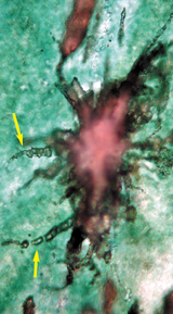 IT’S TUBULAR. The cylindrical structures (arrows) riddling this ancient seafloor lava may have been created by microbes almost 3.5