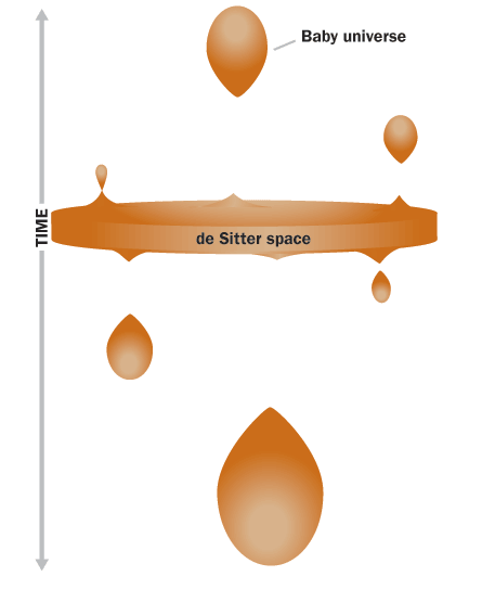 That emptiness, Carroll suggests, would be a high-entropy environment technically known as de Sitter space. “Empty,” however, does not convey a precisely correct description. Because of quantum physics — specifically, the Heisenberg uncertainty principle — an utterly empty space is impermissible. Fluctuations of energy are unavoidable, and on rare occasion one such fluctuation will be huge enough to burst a whole new spacetime bubble into existence — a baby universe. That baby could expand into just the sort of thing that human physicists see in the one bubble they can examine from within.