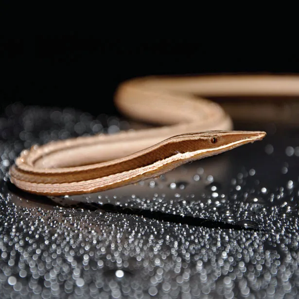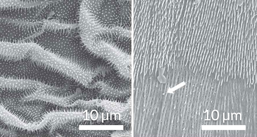 SKIN RIDGES Spiky spines (left) cover the back of the flap-footed lizard Lialis jicari. These spines are also underneath scales on a part of the gecko’s belly (right, top half) that doesn’t touch the ground. Skin that does slide against the ground has flattened ridges (right, bottom), which could help the reptiles slither. Tiny remnants of spines run along the ridges (arrows).