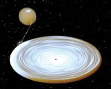 The stolen gas forms a disk around the neutron star. As it does so, it begins spiraling inward, heating up, and emitting X rays. Because the pulsar’s strong magnetic field channels the X-ray-emitting material, the gas falls only onto the star’s magnetic poles. These hot spots rotate along with the pulsar, so that the X rays appear to flicker on and off at the speed of the star’s rotation. While the pulsar sups on its companion, the infalling material stifles the pulsar’s radio emissions, notes Craig Markwardt of NASA’s Goddard Space Flight Center in Greenbelt, Md.