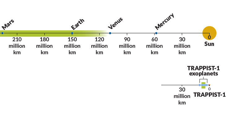 In our solar system, the habitable zone (green) extends more than 160 million kilometers, from just beyond Venus (at about 110 million kilometers from the sun) to beyond Mars. Around the relatively cool star TRAPPIST-1, a mere 11 percent as wide as the sun, the habitable zone is much closer and narrower. Three of its planets are in the habitable zone. (Planets are not to scale.)