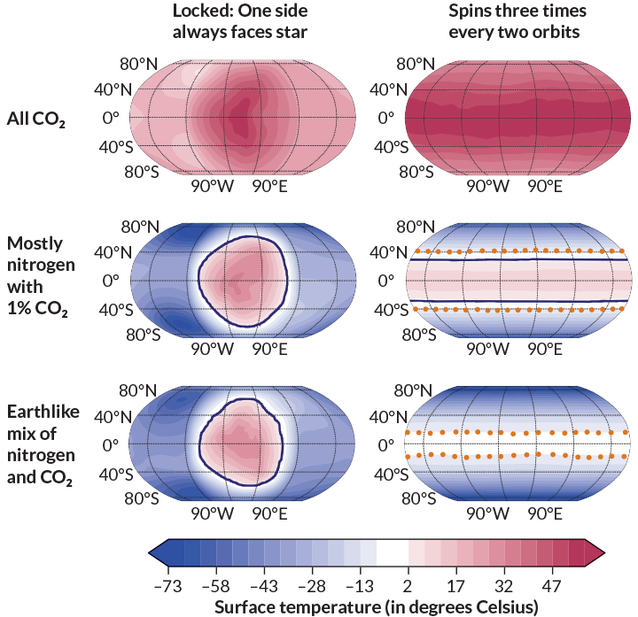 Surface temperatures on Proxima b, a small planet orbiting the dim red star nearest to Earth, depend on the planet’s spin and the makeup of its atmosphere. In six of many possible scenarios (shown below), solid lines mark areas where liquid water could endure year-round. Orange dots mark zones with seasonal water potential.